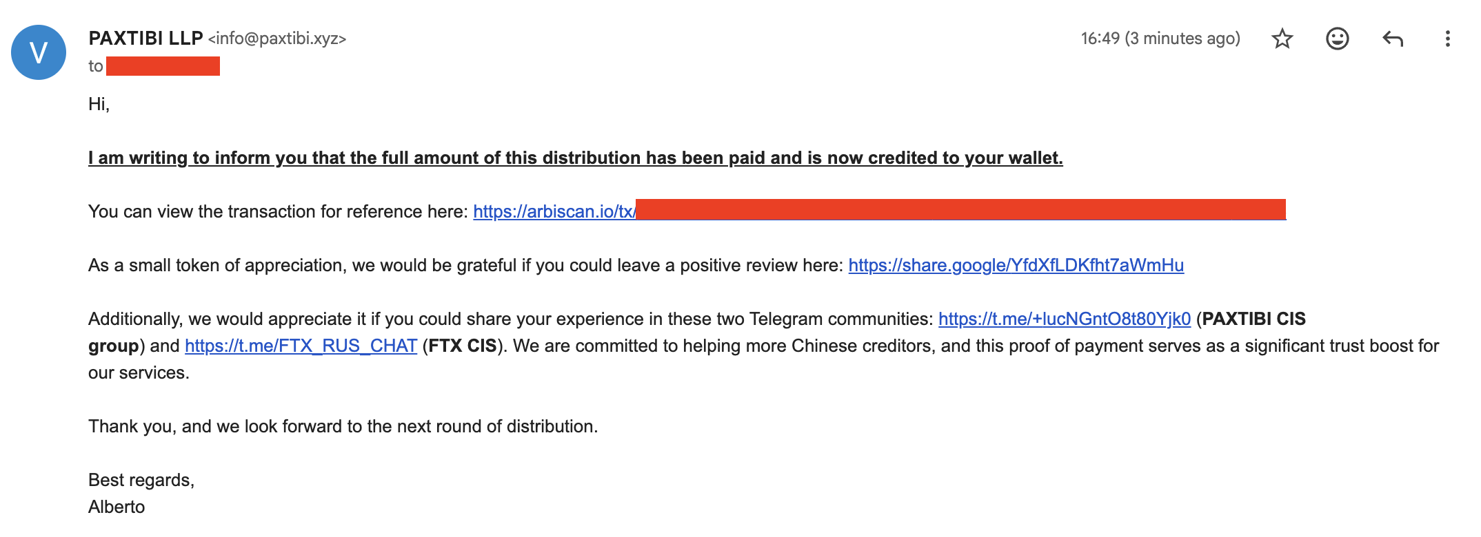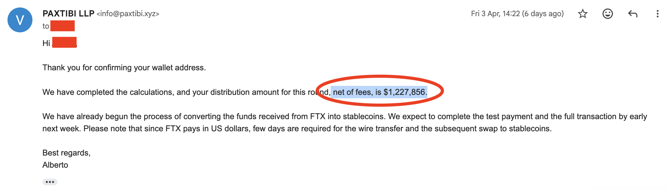 대신 PAXTIBI는 회수된 금액에 대해 성공 수수료를 부과합니다. 즉, FTX가 지급하면 당신과 PAXTIBI 모두 이익을 얻습니다 — 청구가 회수되고 PAXTIBI는 작업에 대한 보상을 받습니다. FTX가 지급하지 않으면 PAXTIBI는 아무것도 얻지 못합니다. 이는 우리와 당신의 이해관계를 일치시키는 윈윈 솔루션입니다.